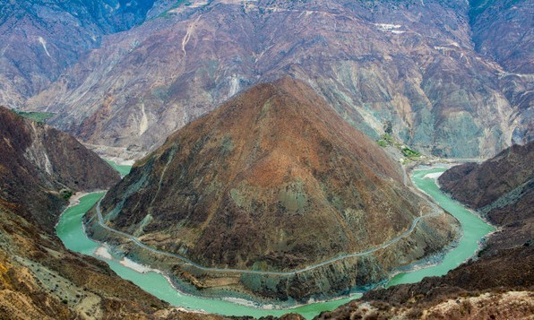 9:00出发乘车到远观长江第一湾,登上观景台可以远眺长江第一湾。之所以称这里为长江第一湾,是因为长江从青藏高原一路走来,到了石鼓镇后因山崖阻挡便掉头急转东北而去,形成一个巨大的U 形转弯,正所谓“江流到此成逆转,奔入中原壮大观”!经过松园桥丽江和香格里拉交界【第一次过金沙江】
