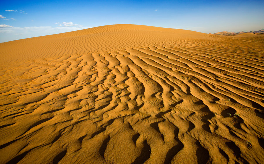 库布齐沙漠——大漠上的弓弦放眼望去,大漠浩瀚,长河如带,沙海茫茫,朝日浑圆,月弯似钩,气魄宏大,如诗如画。库布其沙漠中新月型沙丘链、罕见的垄沙和蜂窝状的连片沙丘等诸多沙漠景观自然神奇,是原汁原味的大漠风光,给人以发自内心的震撼。