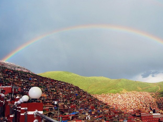早餐过后告别观音桥镇,前往翁达,历史上这里是茶马古道的途经之地,也许是因为气候的原因,曾有人将这里称为高原牧区的小江南。继续前往色达五明佛学院;距色达县城20余公里有一条山沟叫喇荣沟,顺沟上行数里,便能见到藏于深山中的喇荣寺五明佛学院,也称色达佛学院。这里的僧舍很壯观,如果你是初次到色达,其庞大的阵势往往会让你目瞪口呆;在佛学院的山峰上,有一个金碧辉煌的建筑,叫做“坛城”(音译)。下面一层是转经筒,金色的圆筒在人们干枯的手转过之后留下一串悠长的嘎吱嘎吱的响声。晚上住五明佛学院山上,天气好还可以看到满天星河。